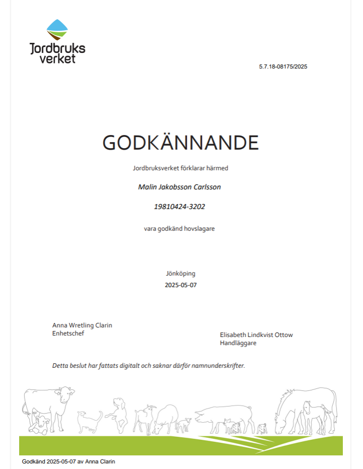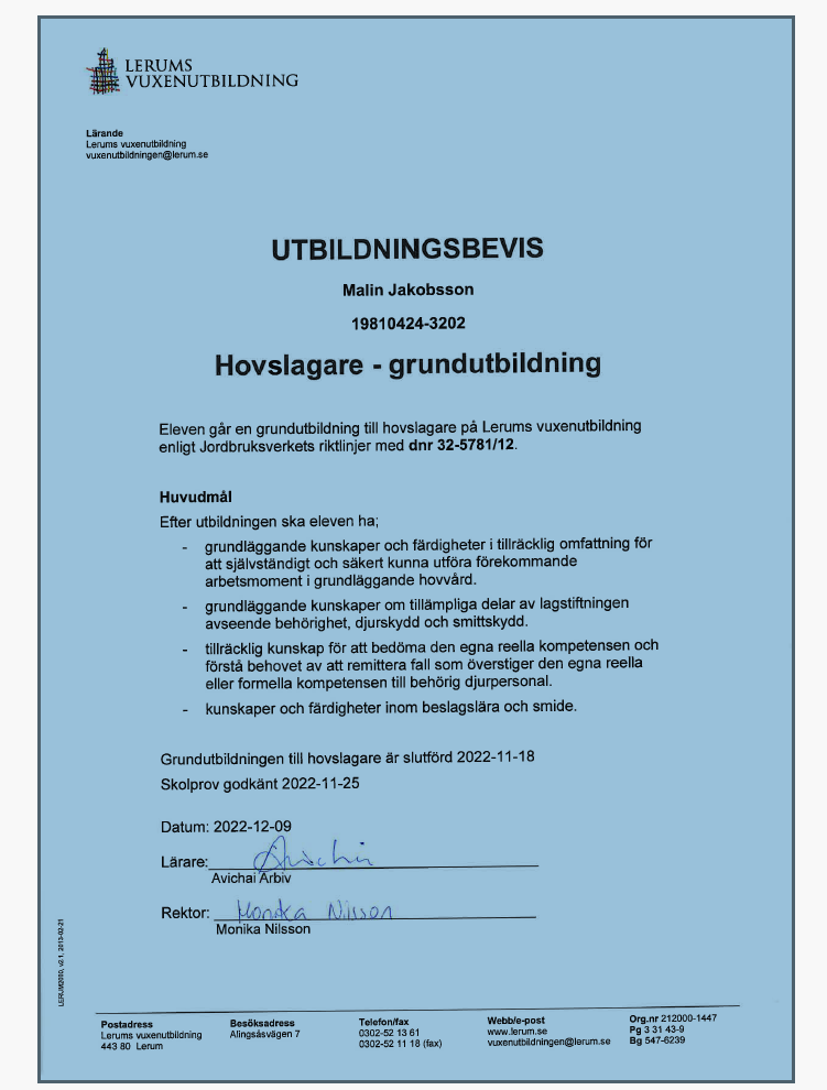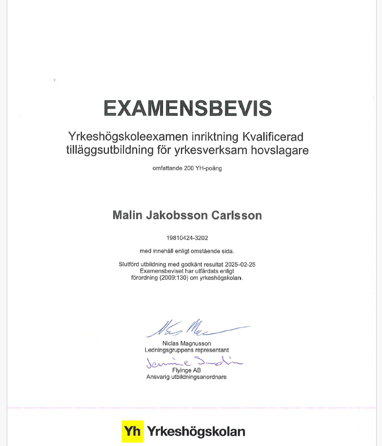 Att välja en godkänd hovslagare är viktigt för hästens hälsa, säkerhet och välmående. En godkänd hovslagare har rätt utbildning och kompetens, följer lagar och regler, och ser till att hästens hovar är i bra skick. Detta minskar risken för skador och problem, samt underlättar samarbetet med veterinär om det behövs. En godkänd hovslagare har också ofta en ansvarsförsäkring som ger trygghet för både häst och ägare.